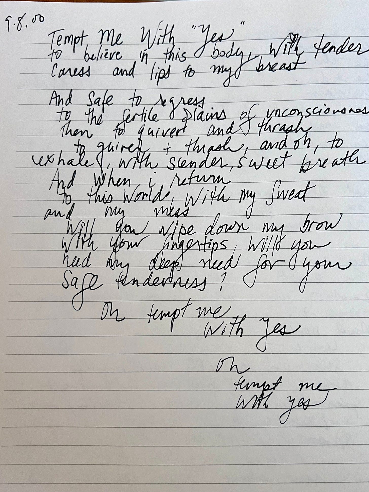 I wrote this in Y2K. I’ve been bandying it around for months, playing with formatting, tweaking the meter, but I could not decide what in “wanted” to be: poem? Lyric? Should I create a stronger point of view?